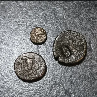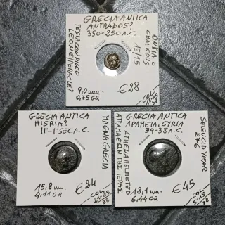 Lotto composto da 3 monete Grecia Antica. --- Moneta 1: Antrados, 350-250 a.C., testa con pileo, Leone Heracle, 9,0 mm, 0,75 gr, valore €28. ---Moneta 2: Hisria, II°- I° sec. a.C., Magna Grecia, 15,8 mm, 4,11 gr, valore €24. ---Moneta 3: Apameia, Siria, 39-38 a.C., Seleucid Year 276, Athena helmeted, 18,1 mm, 6,44 gr, valore €45. Ottimi rilievi Come da immagini