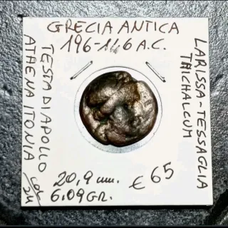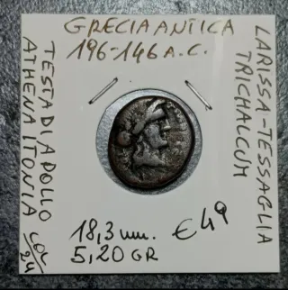 Moneta antica Grecia di Larissa, Tessaglia, datata tra il 196 e il 146 a.C. - Dritto: Testa di Apollo - Rovescio: Athena Itonia - Peso: 5,20 gr - Diametro: 18,3 mm - Valore: €49 Pezzo unico molto raro dell'Antica Grecia, dedicato ad Apollo, dio dell'ordine e della giustizia, figlio di Zeus e Leto. Emissione: Larissa, Antica Grecia tra il 196 al 146 a.C. La Lega Tassala, attiva dal 196 al 146 a.C., era una confederazione libera di città-stato della Tessaglia ubicata nella Grecia centrale con capitale Larissa.