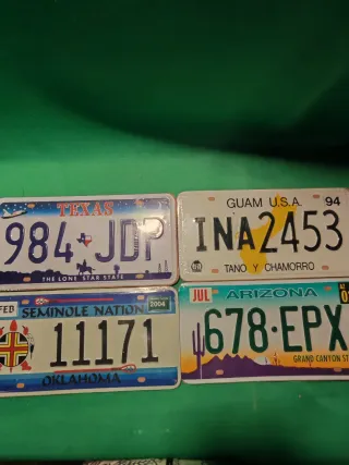 Set di quattro targhe automobilistiche decorative in metallo. - Targa Texas The Lone Star State - Targa Guam U.S.A. Tano Y Chamorro - Targa Seminole Nation Oklahoma - Targa Arizona Grand Canyon State