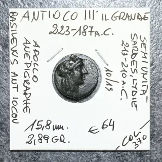 Moneta Antica Grecia Antioco III il Grande 223-187 d.C. - Periodo: 213-210 a.C. - Località: Sardes, Lydie - Tipo: semi unità - Diametro: 15,8 mm - Peso: 2,89 gr. - Dritto: Testa di apollo - Rovescio: BASILEWS ANT IOCOU Rarità Ottimi dettagli Buona conservazione Come da immagini