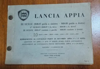 Supplemento al catalogo parti di ricambio per Lancia Appia I e II serie, III serie (per informazioni più dettagliate vedere foto di copertina ) , II edizione del 1960, pagine imbrunite , originale, completo.