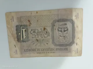 Banconota da 1 scellino emessa dalla British Military Authority. - Valore: 1 Scellino - Autorità emittente: British Military Authority - Design con immagine di un calice e simbolo 1/-