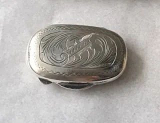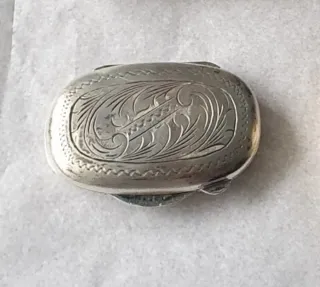 Elegante scatolina in argento massiccio 800. - Decorata con incisioni floreali e motivi geometrici. - Forma ovale e compatta. - Finitura lucida con segni d'uso: lieve ammaccatura nella parte inferiore, e manca la vite di chiusura. Misure: cm 4,5 x 3,5 x 1 circa. Peso: 16 grammi.
