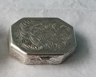 Elegante scatolina ottagonale in argento massiccio 800. Decorazioni su tutti i lati: incisioni floreali e motivi geometrici. Misure: cm 7,3 x 4,5 x 1,5. Peso: 30 grammi.