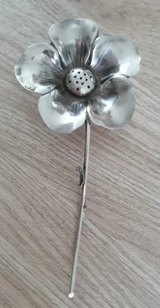Fiore porta sale in argento massiccio 800, degli anni '80, oggetto raffinato e dettagliato, di gioielleria italiana. Argento di buona fattura. Nota: sullo stelo, mancano due foglie. Misure: cm 14 x 7; diametro dello stelo mm 3; peso 26 grammi.