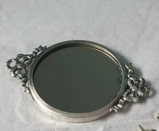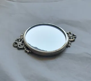 Raffinato specchietto in argento massiccio 800, degli anni '80, di gioielleria italiana. Argento di buona fattura. Misure: diametro cm 5½ + 3 di decorazioni laterali, spessore mm 5; peso 39 grammi.