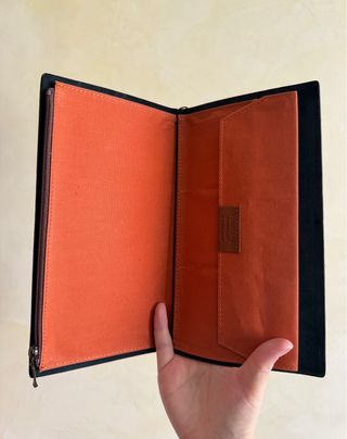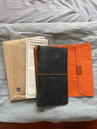 Traveler's Notebook blu regular size with orange cotton zipper case The cotton zipper case is stained blue by the blue leather