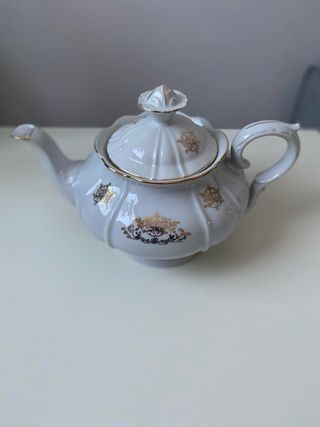Elegante teiera vintage in porcellana bianca, con finiture dorate e decorazioni floreali. Design con nervature verticali. Coperchio decorato con pomello a forma di fiore, decorazioni con delicati boccioli di rose stilizzati in oro. - Marca: Bavaria - Materiale: Porcellana - Colore: Bianco con dettagli oro - Stile: vintage anni 50