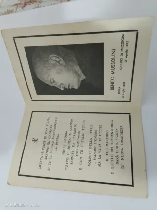 Santino originale dell'epoca raffigurante Benito Mussolini. - Data: 28 Aprile 1945 - Luogo: Giulino di Mezzegra - Nascita: 29 Luglio 1883 - Testo commemorativo sulla patria e sul martirio.