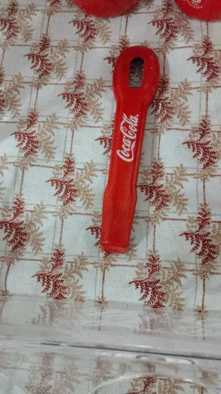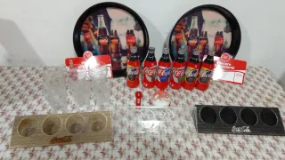 Lotto misto di oggetti Coca Cola da collezione. - Due vassoi rotondi con immagini Coca Cola. - Sei bottigliette Coca Cola decorative. - Quattro bicchieri in vetro con logo Coca Cola. - Un apribottiglie rosso Coca Cola. - Un porta bicchieri in legno. - Un porta bicchieri in legno scuro. - Un oggetto trasparente con logo Coca Cola.