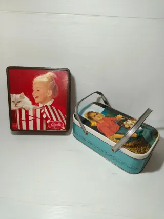 Scatola latta vintage Lazzaroni (Dimensioni: 23,5 x 21,5 x 8 cm. circa.) e scatola con manici Perfetti. (Dimensioni: 29x16x10 cm. circa.). In buone condizioni come da foto, qualche segno e piccole ammaccature. Prezzo per la coppia.