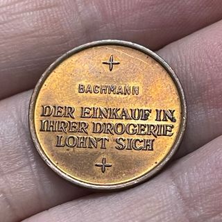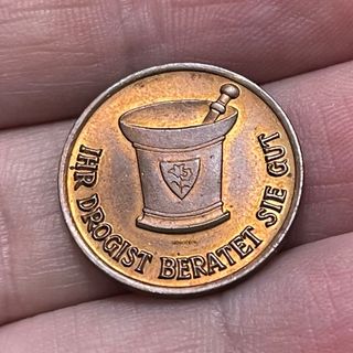 Getone della Drogeria Buchi, proveniente dalla Svizzera. - Dritto: Mortaio con pestello e stemma. - Rovescio: Scritta IHR DROGIST BERATET SIE GUT.