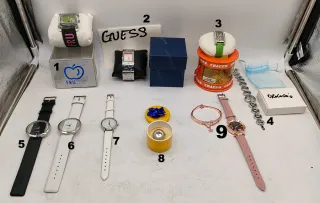 Lotto misto di 9 Orologi da polso, alcuni di marche famose e altri dal Design Vintage e/o Moderno. Ideali per collezionisti o per chi cerca un accessorio unico. Rarità INTROVABILI. - Orologio FRUTTA con cinturino nero. - Orologio GUESS con quadrante rosa e cinturino argentato. - Orologio con cassa argentata e cinturino verde CHARRO. - Orologio in miniatura, utilizzabile come anello, rarità. - Altri Orologi come da foto.
