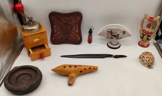 Lotto composto da 9 oggetti di vario genere, con un tocco Etnico e Vintage. - Antico macina caffè in legno e metallo. - Sottopiatto decorativo in legno intagliato a mano. - Piccolo portachiavi Zulù Etnico. - Portatovaglioli in ceramica con decorazioni. - Piccolo vaso a forma di maschera, dipinto a mano, Souvenir Congo. - Coltello decorativo in legno scuro, intagliato a mano. - Ocarina in legno, risalente al 1950 in legno intagliato a mano, ANTICA RARITÀ INTROVABILE, PEZZO UNICO. - Conchiglia Oceano Atlantico. - Base rotonda in legno scuro, utile come sottovaso o posacenere, intagliato a mano. Cedo tutto in blocco, NO separatamen