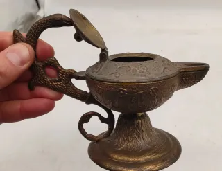 Lotto composto da oggetti vintage, alcuni dei quali rari e da collezione. - Lampada a olio in metallo, braciere porta-incenso, in stile antico, finemente decorata, proveniente dall'Algeria (Africa, 1973). - Raro e Antico Souvenir di Monaco di Baviera (Germania, 1957) con finiture in legno e metallo, completa di cordino decorativo. - Portachiavi con catenella, ideale come portachiavi o soprammobile.