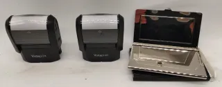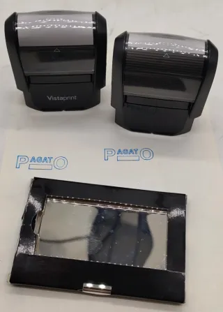 In vendita un lotto composto da due timbri Vistaprint e un porta biglietti da visita, tutto nuovo, mai usato. - Due timbri Vistaprint, PAGATO. - Un porta biglietti da visita.
