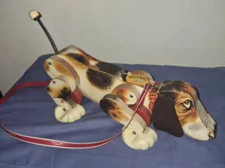 Cane Snoopy giocattolo da trainare, un classico Fisher Price. - Design colorato e vivace. - Realizzato in legno e plastica. - Corda per trainarlo inclusa.