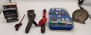 Lotto di vecchi utensili e attrezzi da lavoro Vintage, ma ancora utilizzabili o da Collezione. - Timbro Trodat. - Trapano a mano. - Set di punte per trapano. - Bilancia vintage. Cedo intero lotto, NO separatamente.