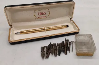 Set di punte da penna antiche e una penna dorata Cross. Cedo lotto intero, NO separatamente. Oggetti da Collezione, Vintage. - Penna dorata con finitura a righe. - Include una selezione di punte da penna di varie forme. - Custodia originale. - Scatola trasparente per le punte.