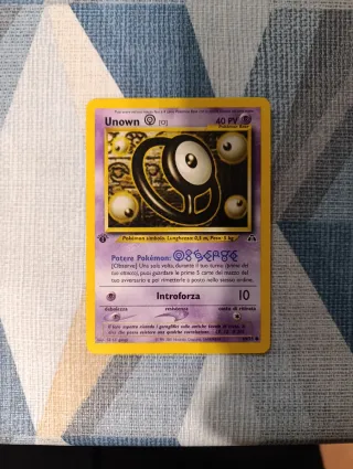 Carta Pokémon Unown E, prima edizione. - Potere Pokémon: Enigma - Introforza - Debolezza, Resistenza, Costo di ritirata visibili.