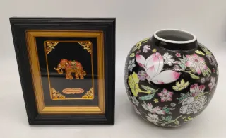 Bellissimo set composto da un piccolo quadro decorato "a mano" e raffigurante un elefante dorato e un vaso in ceramica cinese con decorazioni floreali dipinte anch'esse in modo artigianale. Oggetti Vintage rari, risalenti agli anni '70, quasi introvabili. - Cornice con elefante Made in Thailand. - Vaso in ceramica con motivi floreali, stile cinese. Cedo tutto in blocco, NO separatamente. Guarda anche gli altri miei annunci!, ho altre rarità e utilità interessanti.