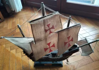 Modellino di una caravella a 3 alberi, la Santa Maria. Un pezzo da collezione per gli amanti del mare. - Dettagli accurati della nave. - Bandiere con croci rosse. - Base di supporto inclusa. - Larghezza cm. 52. - Altezza cm. 45. - Peso Kg. 2