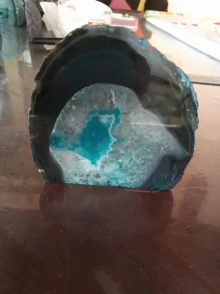 Bellissimo pezzo da collezione in agata azzurra, a forma di goccia. Misura 90/57/18 mm - Cristalli interni luminosi. - Gradazioni di colore dal blu intenso al bianco. - Base trasparente inclusa.