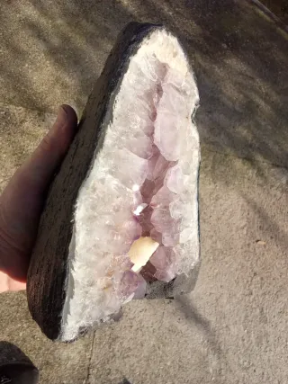 Bellissimo geode di ametista brasiliana con cristalli viola ... alla base un cristallo di calcite... misura 230/150/100 mm e pesa 4,240 kg - Pezzo unico da collezione. - Base scura e ruvida. - Interno scintillante con cristalli.