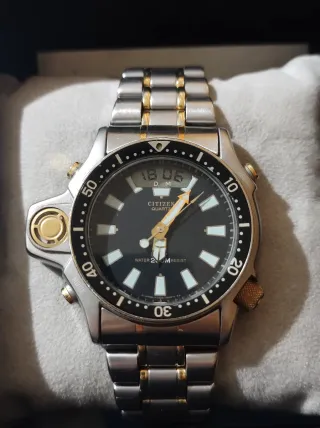 Vendo rarissima referenza di Citizen C022 acciaio/oro . Si tratta della referenza C022 089201 , quella che usciva di fabbrica con il bracciale in acciaio dual-tone e non uno dei "soliti" C022 088093 che nascevano col cinturino in gomma a cui è stato messo il bracciale in un secondo momento. L'orologio si presenta in ottime condizioni mantenendo tutta la sua originalità. Viene fornito anche il cinturino in gomma originale dell'epoca ancora morbido . L'orologio é completo della scatola in cui é stato venduto in gioielleria ed è presente anche la garanzia originale e il libretto istruzioni in italiano. Guarnizione del fondello nuova