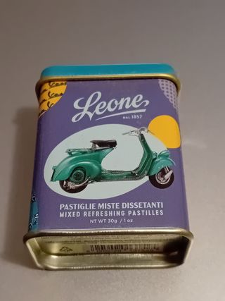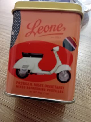 Scatolina in latta / metallo celebrativa del modello "Vespa" simbolo dell'italia. Qui in collaborazione con Leone, ditta iconica italiana dal 1857, produttrice di caramelle, si e' realizzata una scatola da collezionisti esperti . Non puo' mancare nella vostra vetrinetta . Il formato e' tascabile ed era di circa 30g. Introvabile da intenditori. Ringrazio e resto a disposizione per le informazioni in chat. Curiosate e troverete altre rarita' legate al vintage. A presto Daniel