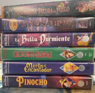 Collezione di 6 nastri VHS dei Classici Disney. - Dinosauro - La Bella Addormentata - Robin Hood - La Misteriosa Pietra di Fuoco - Pinocchio - Merlino l'Incantatore (In questo la scatola non chiude del tutto)