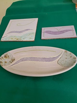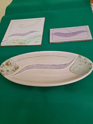 Set coordinato 3 pezzi di ceramica realizzati dal maestro di ceramica Salvatore Autuori 1) Svuotatasche cm 32x14 - 2) mattonella autografata cm 20x20 - 3) Piastrella cm18x9 si riscontrano piccole abrasioni che non incidono sulle caratteristiche dei predetti