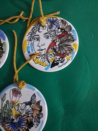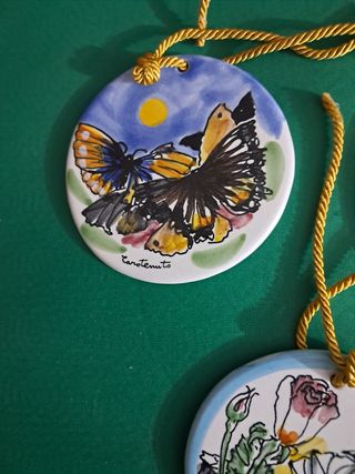 Bellissime formelle di ceramica vietrese, perfette per decorare l'albero di Natale o la casa durante le festività. - Dipinte a mano con dettagli delicati. - Motivi natalizi con farfalle e fiori. - Perfette come bomboniere o piccoli regali. - Include 3 formelle con soggetti diversi.