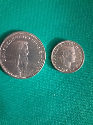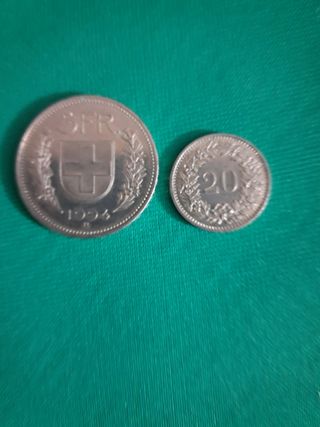 Vendo due monete svizzere in buone condizioni. - Una moneta da 20 centesimi del 1931. - Una moneta da 5 franchi del 1994.