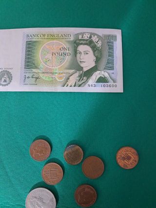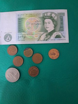 Vendo una banconota da una sterlina e 7 monete inglesi. Le monete mostrano segni di usura dovuti al tempo, ma sono in buone condizioni generali. La banconota è ben conservata. - Una banconota da 1 sterlina. - 7 monete di vario taglio.