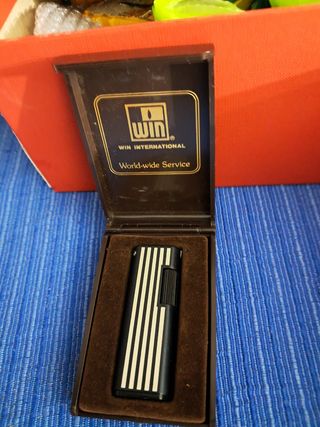 Accendino da collezione WIN International, in ottime condizioni. - Accendino elegante e raffinato. - Colore nero con strisce bianche. - In confezione originale.