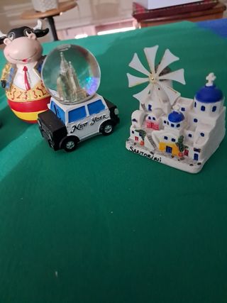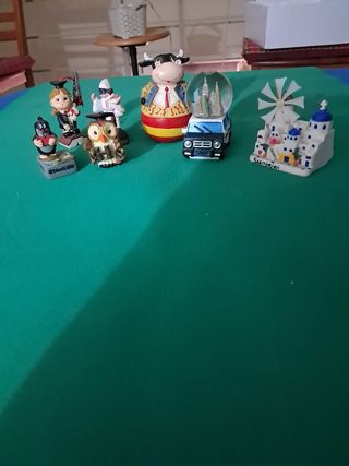 Bellissimo set di 7 figurine souvenir, perfette per collezionisti o amanti dei viaggi. Sono in ottime condizioni e rappresentano diversi luoghi e personaggi. - Include un toro matador, un mulino a vento e case di Santorini, un gufo ,un pulcinella, un auto polizia diNew Jork e una bambina con libro. - Sono tutte piccole e dettagliate. - Perfette per decorare una mensola o una scrivania.