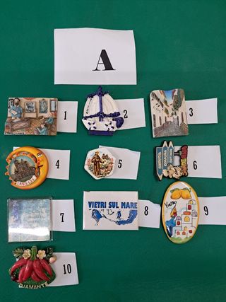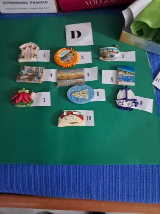 Lotti composti da 10 magneti da collezione, raffiguranti varie località e temi italiani per un totale di 40 si vendono anche lotti separatamente - Magnete L'insegnante - Magnete con barca a vela - Magnete con strada di Lipari - Magnete con Assisi - Magnete con San Francesco - Magnete con Barbagia Gallura - Magnete Vietri sul Mare - Magnete con Vietri - Magnete con peperoncini Diamante - Magnete con frase L'amico è una persona che ignora la palizzata rotta e...