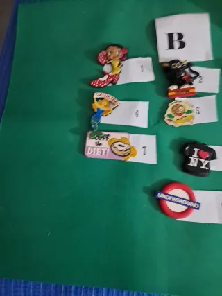 Collezione di magneti souvenir da viaggio. - Magnete con ballerina spagnola - Magnete con toro e bandiera Spagna - Magnete con figura verde e blu - Magnete con figura di orso e Oxford University - Magnete Danmark - Magnete con ciambella e scritta Cuff the Diet! - Magnete con maglietta I NY - Magnete con immagine di un castello - Magnete Underground