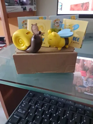 Set di personaggi Animali Mulino Bianco con una lumaca e un'ape. - Personaggio lumaca marrone con guscio giallo. - Personaggio ape gialla con ali azzurre. - Libretti illustrati inclusi.