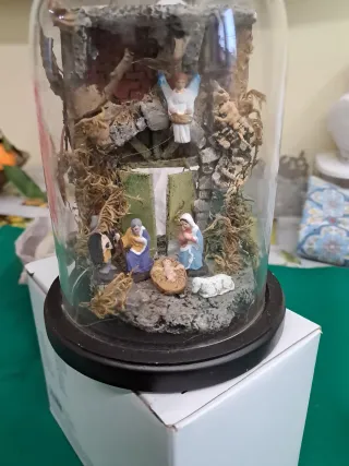 Presepe artigianale completo di statuine e ambientazione, protetto da una campana di vetro. - Ambientazione curata nei dettagli. - Include statuine della Natività. - Base con elementi naturali e rocciosi.