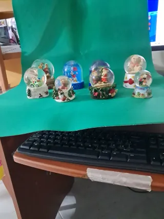 Lotto composto da 8 palle di neve a tema natalizio. - Palla con orsetto e fiocco rosa. - Palla con orsetto e fiocco rosso. - Palla con Babbo Natale e slitta. - Palla con Babbo Natale e auto verde. - Palla con Babbo Natale e albero. - Palla con Babbo Natale e pupazzo di neve. - Palla con Mickey Mouse. - Palla con scena natalizia.