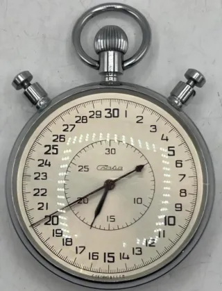 Cronometro meccanico Slava originale dell'URSS. - Cassa in metallo. - Quadrante bianco con indici neri. - Lancette scure.