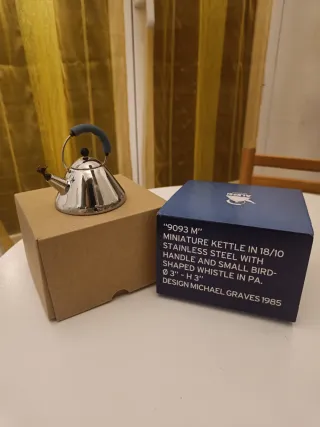 Miniatura del celebre bollitore 9093 M di Alessi, disegnato da Michael Graves nel 1985. Un pezzo iconico per collezionisti. - Realizzato in acciaio inossidabile 18/10. - Manico e piccolo fischietto a forma di uccellino in PA. - Dimensioni: Ø 3 - H 3. Bird Kettle miniatura mini Tiny pequeno modernariato vintage Sottsass Memphis gufram Nuovo con scatola, fondo di magazzino