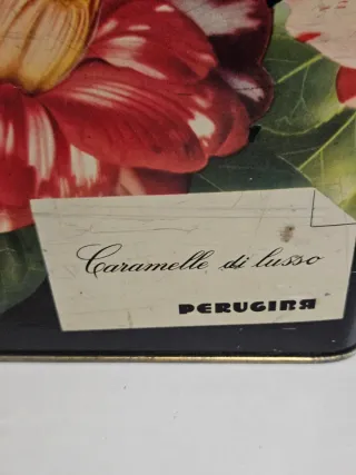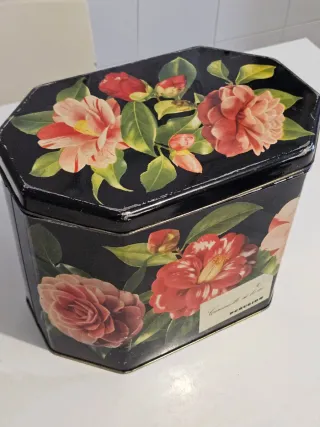 Bellissima scatola vintage PERUGINA con una decorazione floreale su sfondo nero. - Design ottagonale. - Motivo di camellie e foglie. - Etichetta con scritte Caramelle di lusso PERUGINA. - 40*30*20