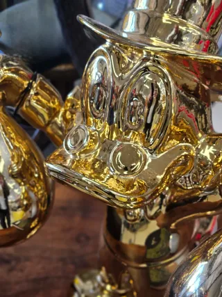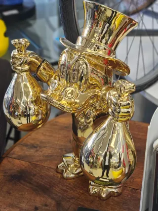 Statua dorata di Paperon de' Paperoni, il famoso personaggio Disney. Rappresentato con il suo iconico cappello a cilindro e sacchi di denaro. - Materiale: metallo dorato lucido. - Design dettagliato del personaggio. - Base stabile.
