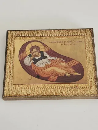 Icona sacra raffigurante l'apparizione della Vergine Maria a San Sergio - Scritta in cirillico PRESVYATAYA BOGORODITSE SPASI NAS (Santissima Madre di Dio, salvaci). - Cornice dorata decorata. - Dimensioni approssimative: 10x12 cm.