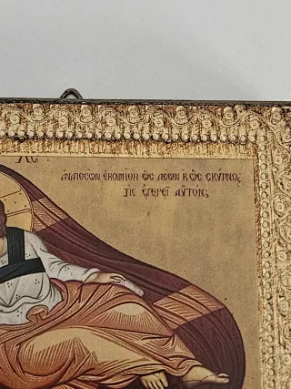 Icona religiosa raffigurante la Madonna con il Bambino Gesù. L'icona è incorniciata in una cornice di legno scuro con dettagli dorati. - Cornice in legno scuro. - Dettagli dorati sulla cornice. - Raffigurazione sacra.