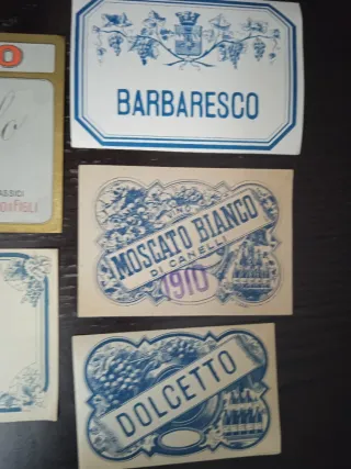 Lotto di antiche etichette di vini piemontesi, risalenti all'inizio del '900. Etichette per Barolo, Barbaresco, Grignolino e Moscato. - Marchi inclusi: Francesco Pittatore, Cantina Sociale Monforte d'Alba, Fratelli Florio, Benso Angelo. - Provenienti da diverse zone del Piemonte, tra cui Alba, Asti e Monforte d'Alba.