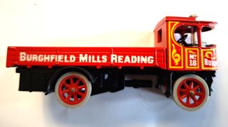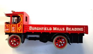 Modellino di camioncino Matchbox Models of Yesteryear Y-18, modello Atkinson del 1918. - sc:160 - Camioncino rosso con dettagli gialli. - Scritta BURGHFIELD MILLS READING sul cassone. - Numero 18 sulla cabina.